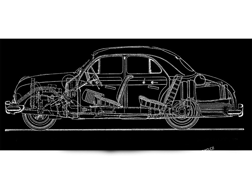 Podélný řez karoserií oblíbeného mladoboleslavského vozu. Všimněte si vytápění vozu s přívodem teplého vzduchu na čelní skla, pohodlného prostoru pro cestující a velkého prostoru pro zavazadla. Prostě tričko, které nesmí chybět ve skříni žádného nadšence na české veterány!