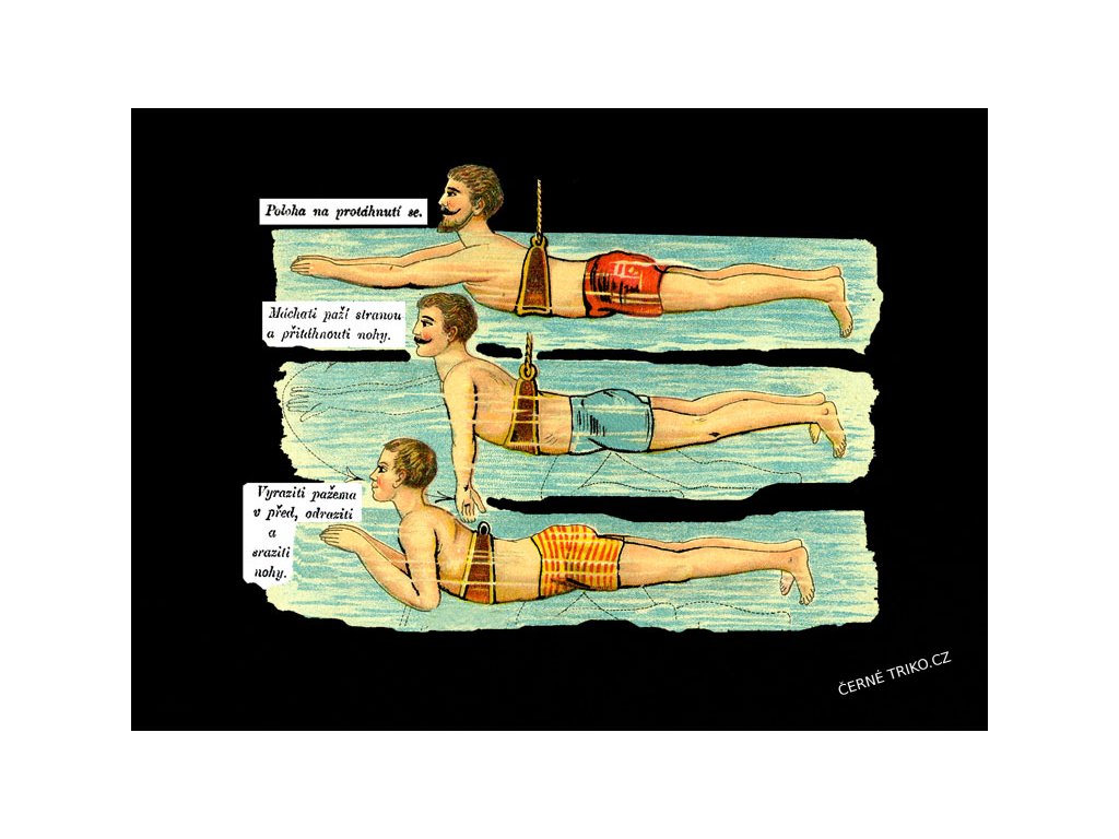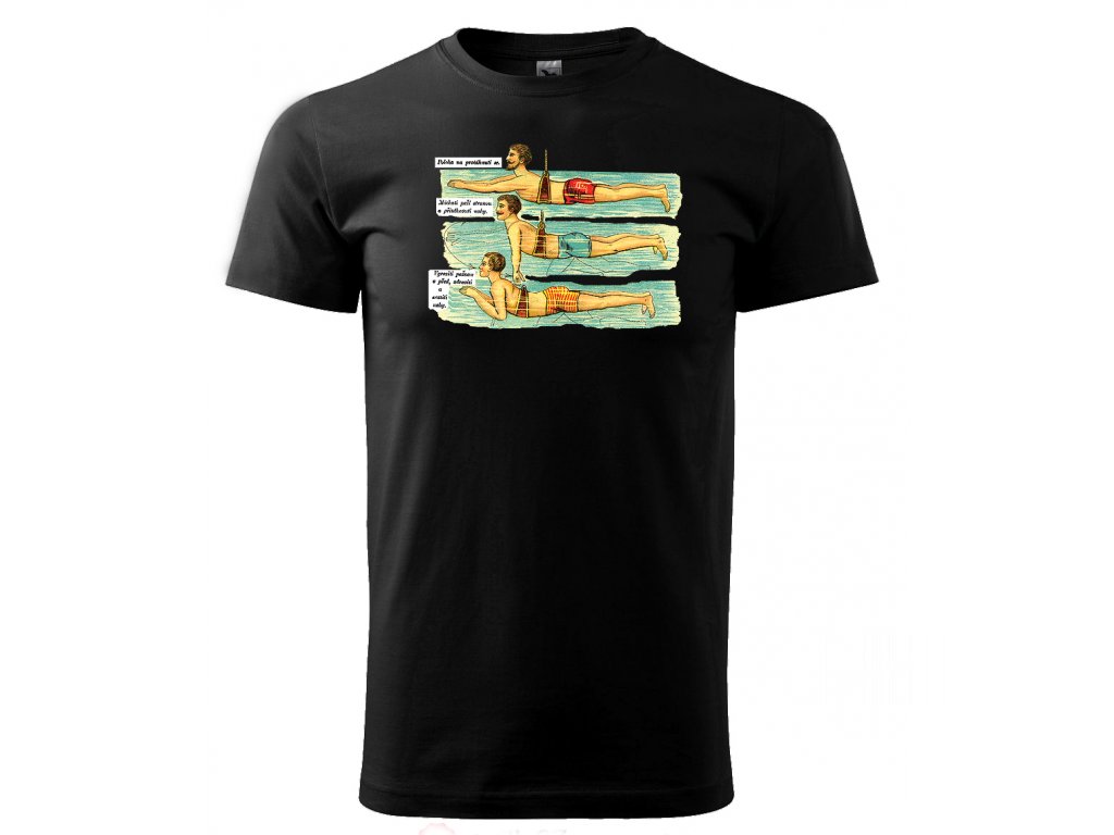 Retro tričko s vtipným potiskem pro budoucí šampióny v plavání. Pohodlné a příjemné bavlněné tričko s jednoduchým návodem jak se naučit plavat. Dobrý tip na dárek pro milovníky vodních radovánek nebo kamaráda, který neumí plavat.