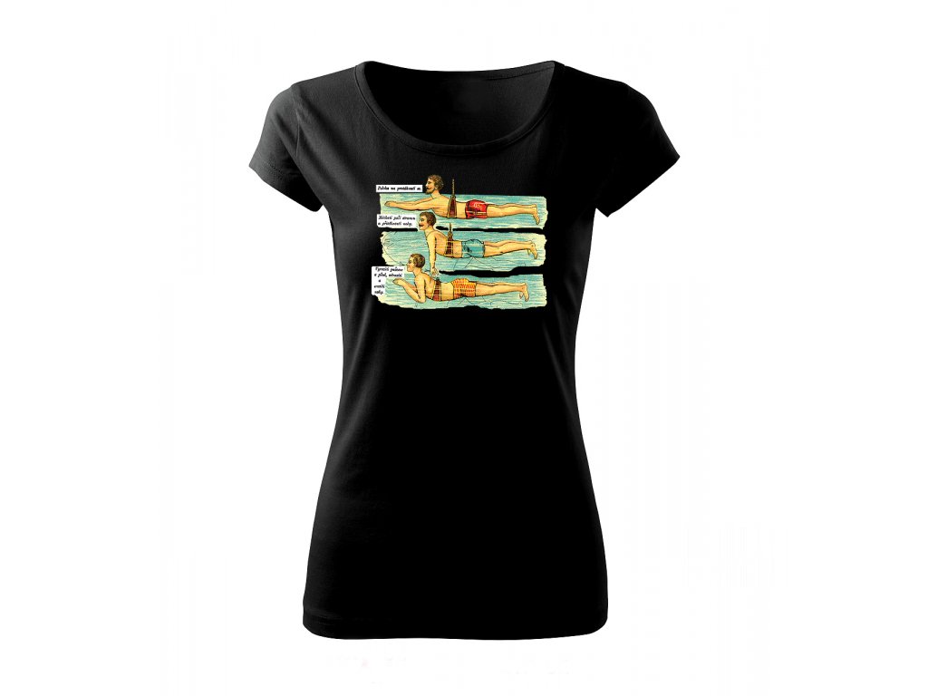 Pohodový a vtipný retro potisk na černém tričku pro milovníky vody a koupání.