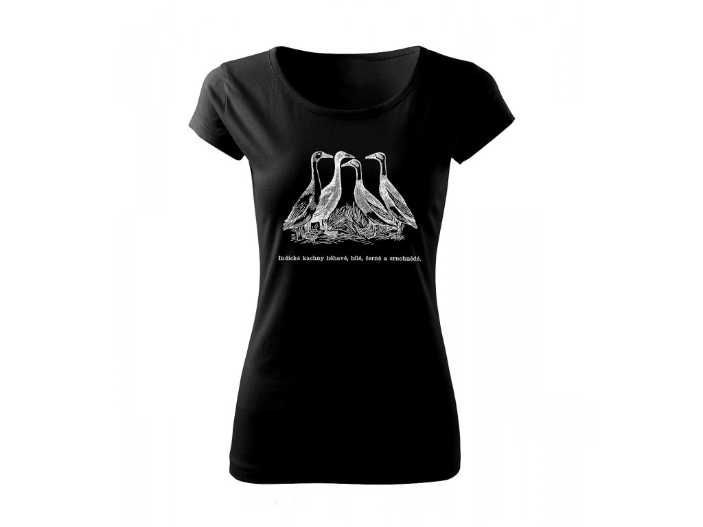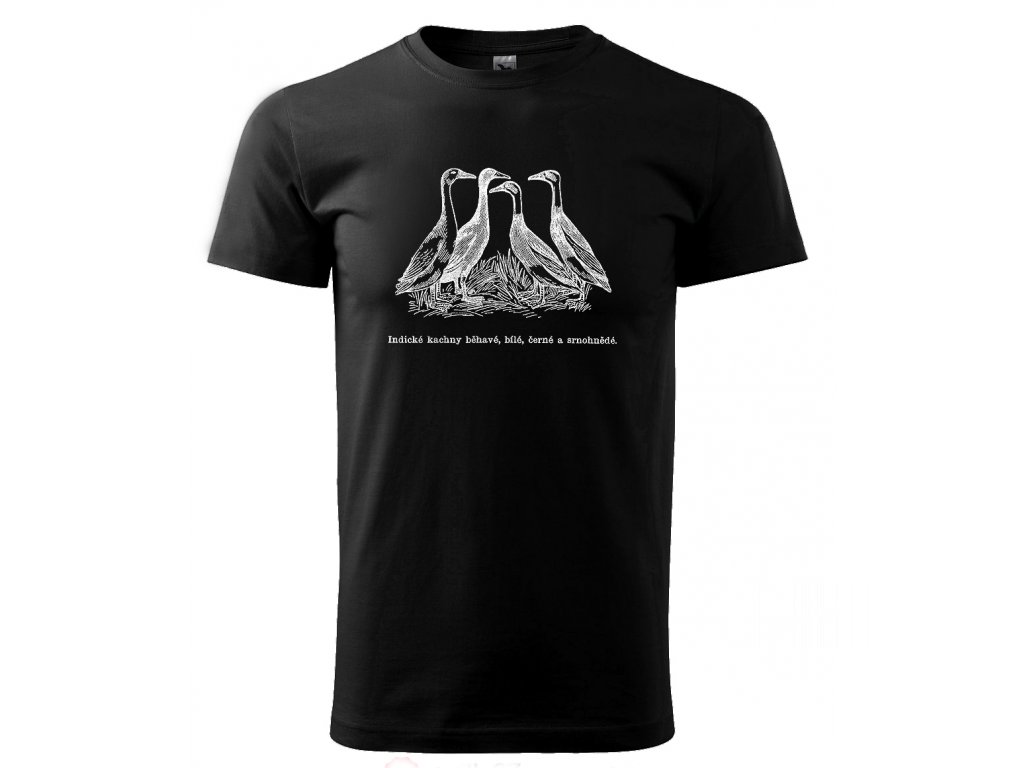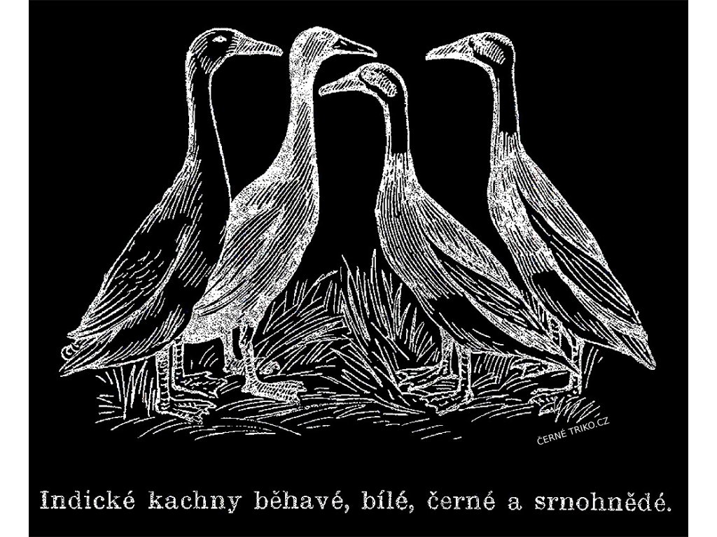 Vtipný retro potisk indických kachen běhavých podle 100 let starého vyobrazení v knize pro hospodáře. Indičtí běžci nejsou nic nového. Potisk je lehký, tvořený pouze tenkou bílou čárou. Vtipný a vkusný dárek pro zahradníky nebo chovatele indických běžců.